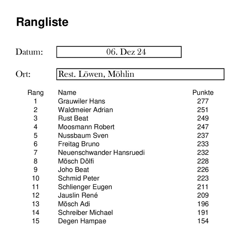 Am 6. Dezember fanden sich 15 Kläuse im Kegelraum des Restaurant Löwen in Möhlin ein. Nüsse, Mandarinen und weitere Leckereien lagen auf den Tischen bereit. Ab 19 Uhr rollten die Kugeln nach vorne. Mal schön fein abgegeben, mal hüpfend wie ein Osterhase, mal präzise platziert, mal der Bande nach an den Kegeln vorbei. Fast jedes erzielte Ergebnis wird analysiert, kommentiert (ouhh, dä isch knapp gsi, nei nid scho wieder, dä het aber schlecht zellt, muss das sii, die Bahn zieht nach rechts, sones Bild chasch gar nit chegle…) oder mit grossem Applaus beklatscht, wenn ein Kranz oder ein Babeli erzielt wurde. Nach 4 Runden hatte der Aktuar alle Hände voll zu tun, um die Ergebnisse zusammen zu zählen. Schon bald war er aber mit der Rangliste fertig. Verdienter Sieger wurde Hans mit 277 Punkten. Aber eigentlich sind ja alle Sieger, denn der Abend hat allen Spass gemacht und da alle einen Grittibänz erhielten war für das Morgenessen die Brotsorte auch schon geklärt! Hallo Fussball-Freunde Bald ist es wieder soweit und die Fussball-EM startet - dieses Mal in Deutschland. Wir von der Männerriege können zwar nicht so gut Fussballspielen, dafür verwöhnen wir euch mit unserem leckeren Essen und kühlen Getränken. So könnt ihr die EM-Spiele in gemütlicher Runde bei uns geniessen. Los geht's am 14. Juni mit dem Eröffnungsspiel. Wir zeigen die spannendsten Spiele der Euro 2024 Für Speis und Trank ist gesorgt - Kommen Sie vorbei und erleben mit anderen Fussball-Freunden einen gemütlichen Fussbal-Plausch! Eure MR Wegenstetten Öffnungs- und Spielzeiten